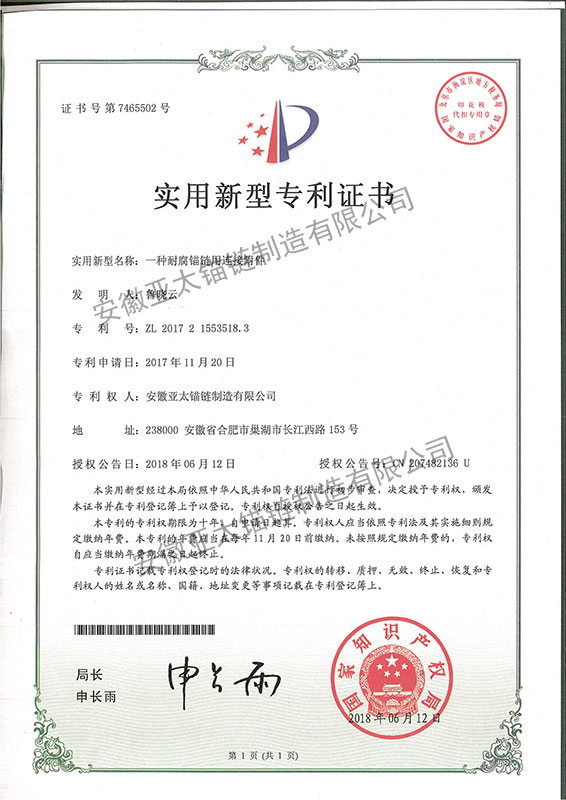 安徽亞太錨鏈制造有限公司是國家高新技術企業(yè),也是國家GB/T 549-2017《電焊錨鏈》標準的起草和制定單位之一。公司旗下設有錨鏈分廠、浮標分廠、舾裝件分廠等多個分廠。公司專業(yè)從事φ12.5mm-φ107mm二、三級船用錨鏈、浮標錨鏈、錨鏈附件,錨、船舶曬裝產品、航標、系船浮、船型標、多種規(guī)格海洋監(jiān)測浮標及航標燈等產品的生產、安裝和服務。目前公司的產品銷往全國各地船廠、碼頭、航標處、航道局、海洋局,并已走上國際市場,如東南亞、中東、歐美等國家。